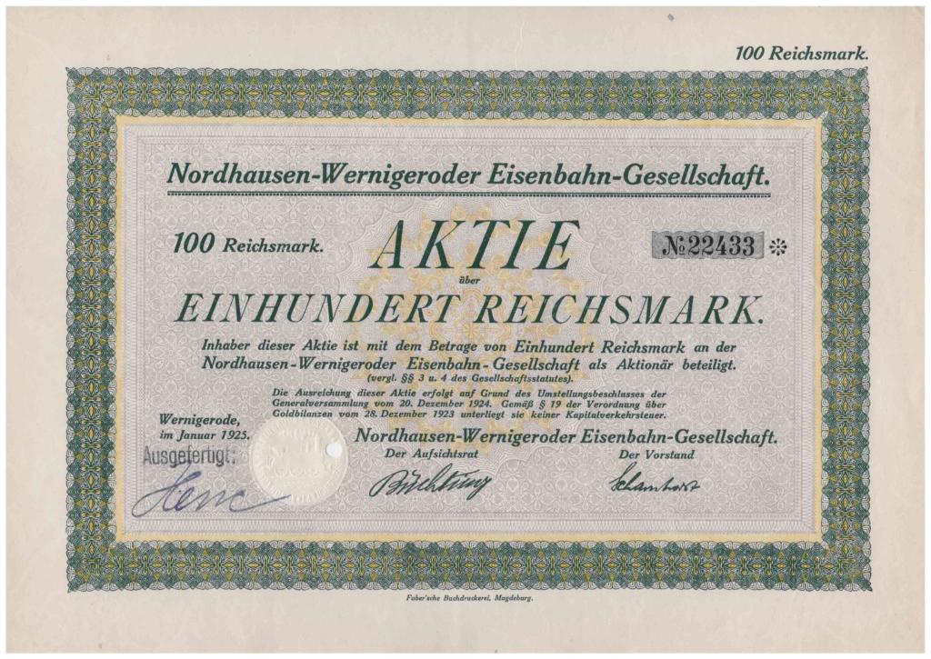Aus meinem Sammlungsfundus biete ich eine historische Aktie der "Nordhausen-Wernigeroder-Eisenbahn-Gesellschaft" (heute Harzer Schmalspurbahn) von 1925 mit dem damaligen Wert von 100 Reichsmark an. In diesem Monat wird sie 101 Jahre alt. Der Zustand ist sehr gut. Bei Interesse bitte ich um ein Gebot.