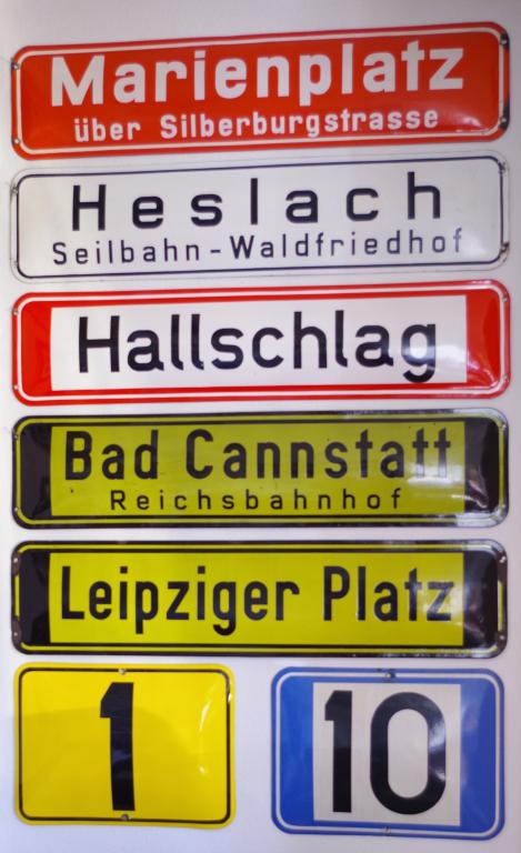 Zum einen Linienschilder (45 x 33 cm) von "1" bis "24", zum anderen Zielschilder (98 x 23 cm) von "B" wie "Bopser" bis "Z" wie "Zuffenhausen".